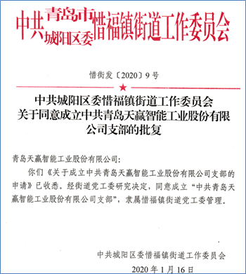 2020年初,經(jīng)上級(jí)黨組織工作委員會(huì)審核決定,青島天贏智能工業(yè)股份有限公司正式獲批成立黨支部,并由中共城陽區(qū)惜福鎮(zhèn)街道工作委員會(huì)頒發(fā)了《關(guān)于同意成立中共青島天贏智能工業(yè)股份有限公司支部的批復(fù)》。
